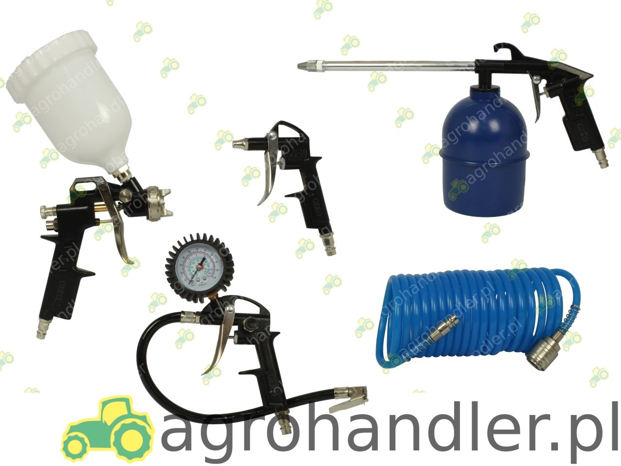 Zestaw lakierniczy 5 elementowy: - pistolet w całości wykonany z metalu, dolny zbiornik do ropowania, maksymalne ciśnienie robocze 7 bar