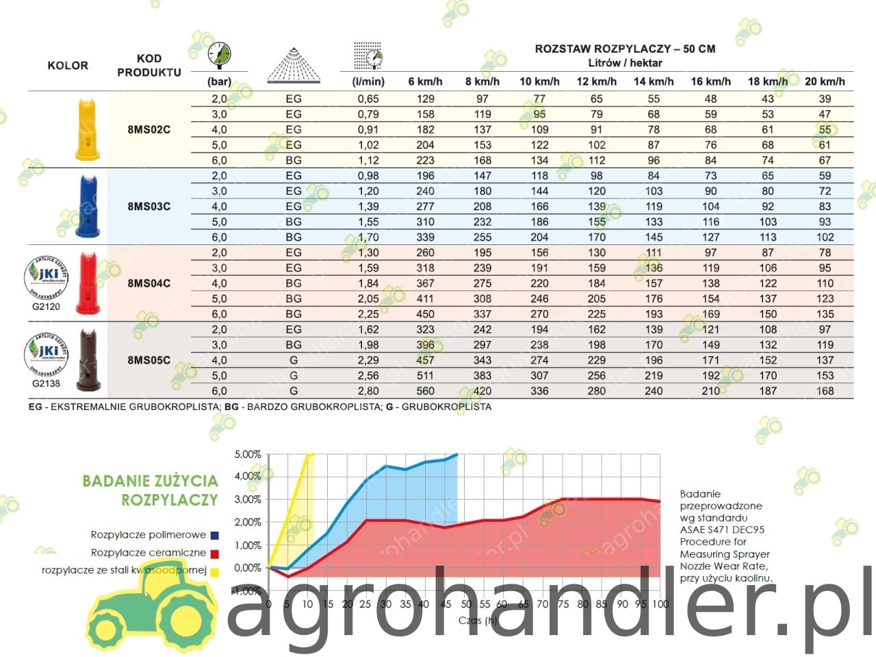 - Pierwsze i jedyne najwyższej jakości Polskie dysze z wkładką ceramiczną; - Jakość potwierdzona certyfikatem PIMR - Przemysłowego Instytu Maszyn Rolniczych w Poznaniu; - Spełnia wymagania ISO dla rozpylaczy rolniczych; - Kolor wg. oznaczeń normy ISO 10625; - Oprysk przy prędkości wiatru do 8 m/s i temp. nawet powyżej 20C; - Wymaga zastosowania kołpaka uniwersalnego 0-103/07U (system Rau) lub 0-103/08U (system Arag) - jako jedyny polski rozpylacz ma potwierdzoną przez niemiecki instytut JKI redukcję znoszenia aż do 90%